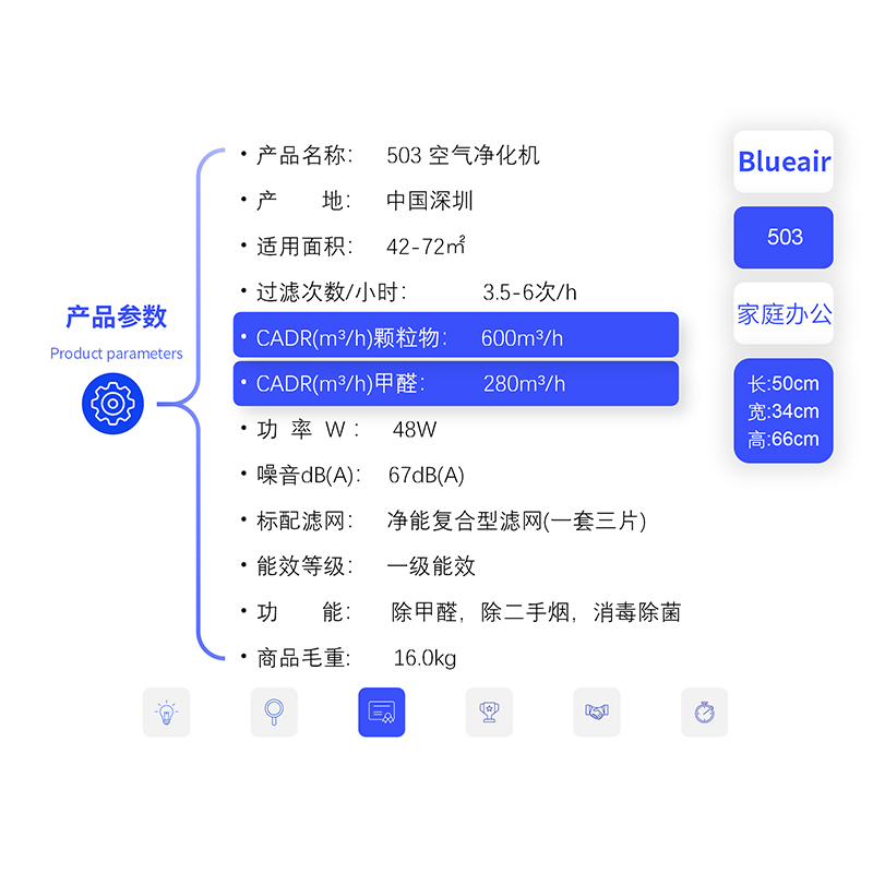 上图中可以看出,整体办公区隔断较多,小型房间较多,故使用中型净化器单独净化效果更好,推荐机型为:布鲁雅尔503,放置点位如上图,详情参数功能及滤芯见下图: